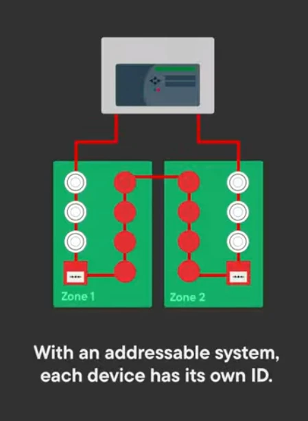 Addressable systems work differently. All devices are connected on one or more loops, and each device has a unique address. The control panel communicates individually with every detector, call point, and module.