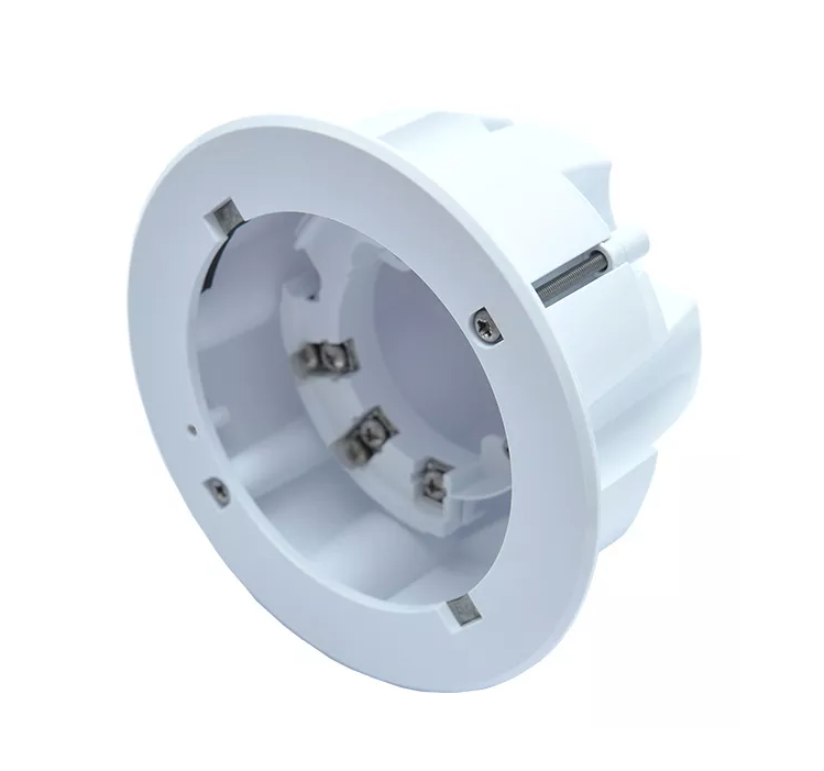 The Soteria Dimension Mounting Box is crafted from white, flame-retardant polycarbonate. It features marked positions for side or top cable entry, ensuring cables are correctly routed. An orientation arrow on the rim helps align the detector accurately during installation.