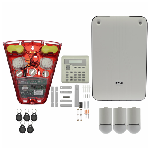 Contains three pet tolerant PIRs, one slim-line door contact, five prox tags, wireless keypad, red external sounder